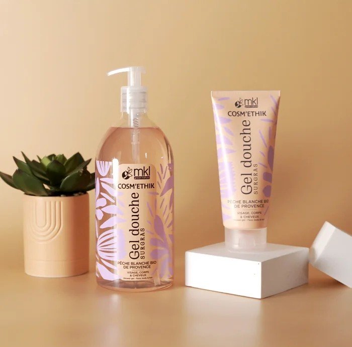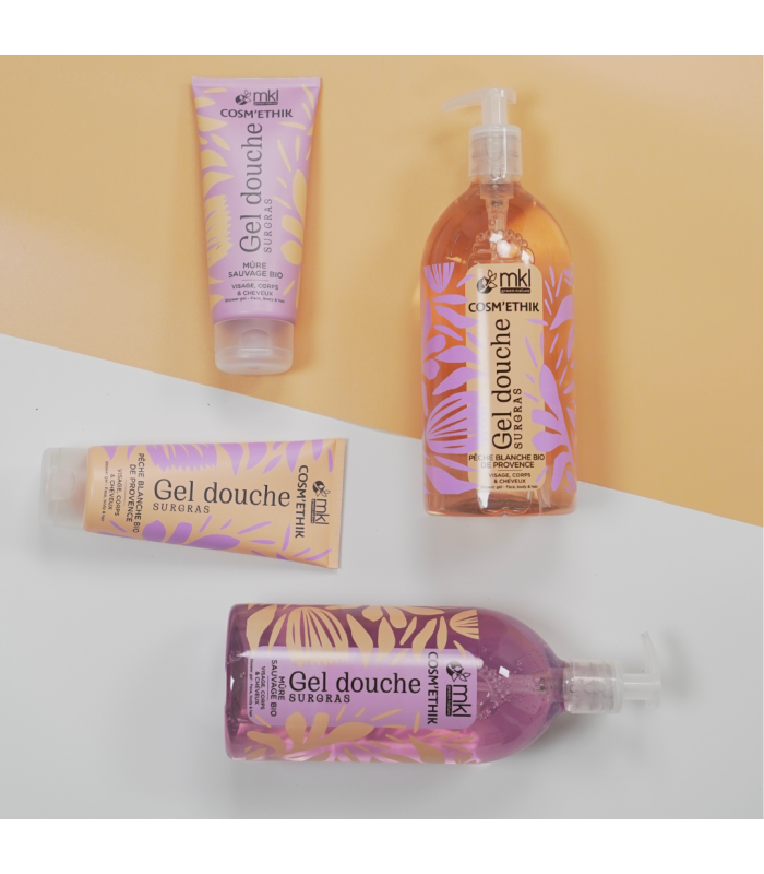 Découvrez notre gel douche surgras à l’extrait de pêche blanche bio ! Un nettoyant 3 en 1 adapté pour le visage, le corps et les cheveux.